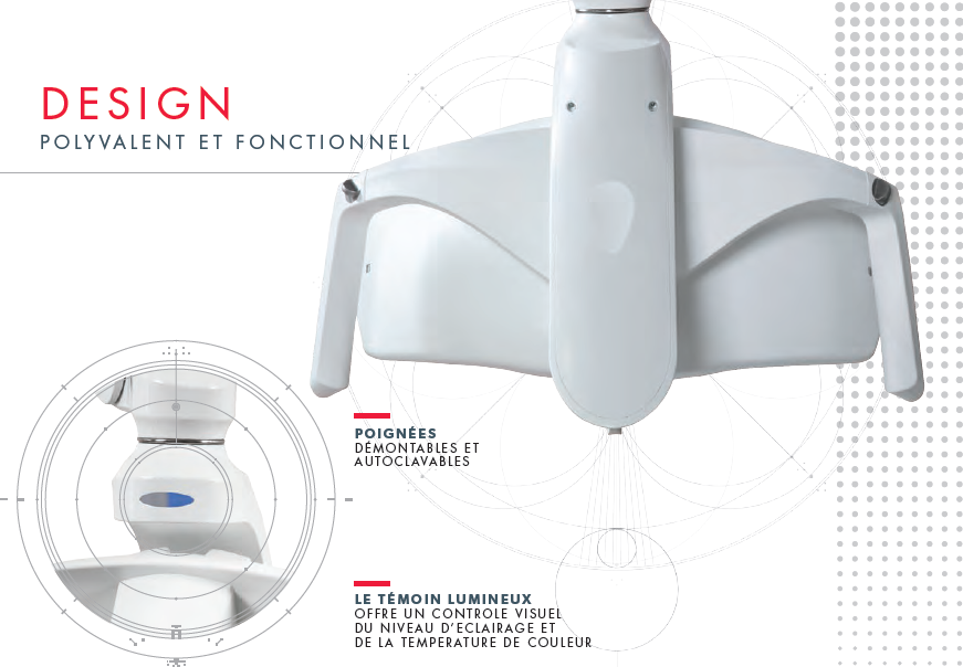 Les poignées, entièrement démontables et autoclavables, garantissent une hygiène optimale. Le témoin lumineux intégré offre un contrôle visuel précis de l’intensité lumineuse et de la température de couleur. La tête de la lampe, avec une rotation pouvant aller jusqu' à 360° selon les modèles, permet d’éclairer aisément toutes les zones de la bouche.